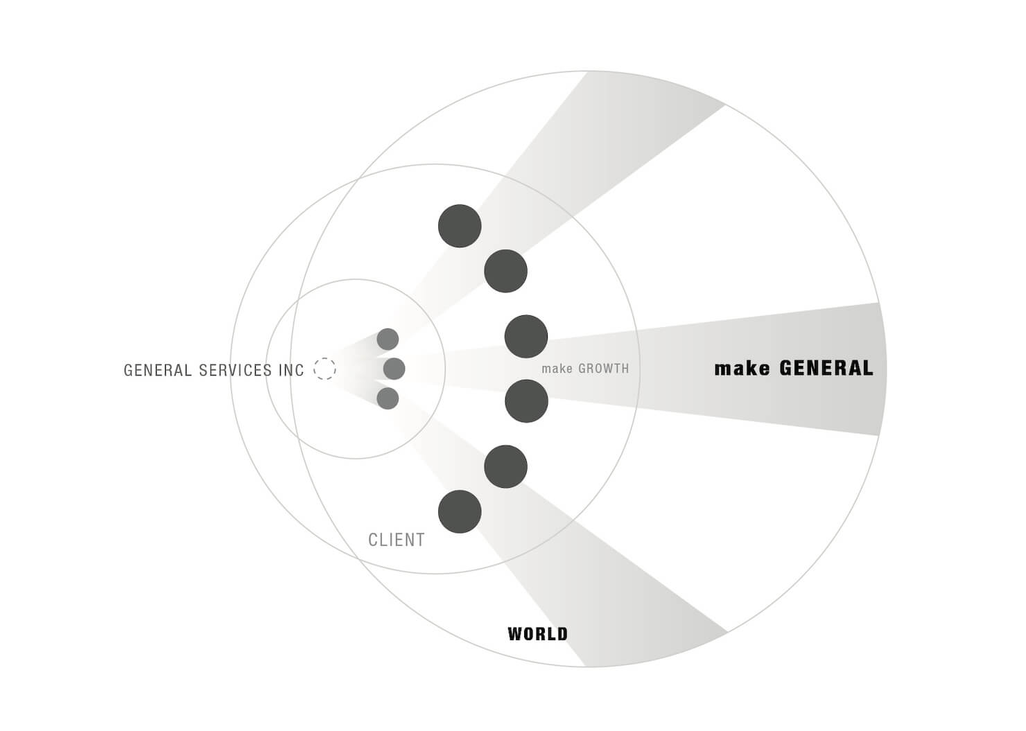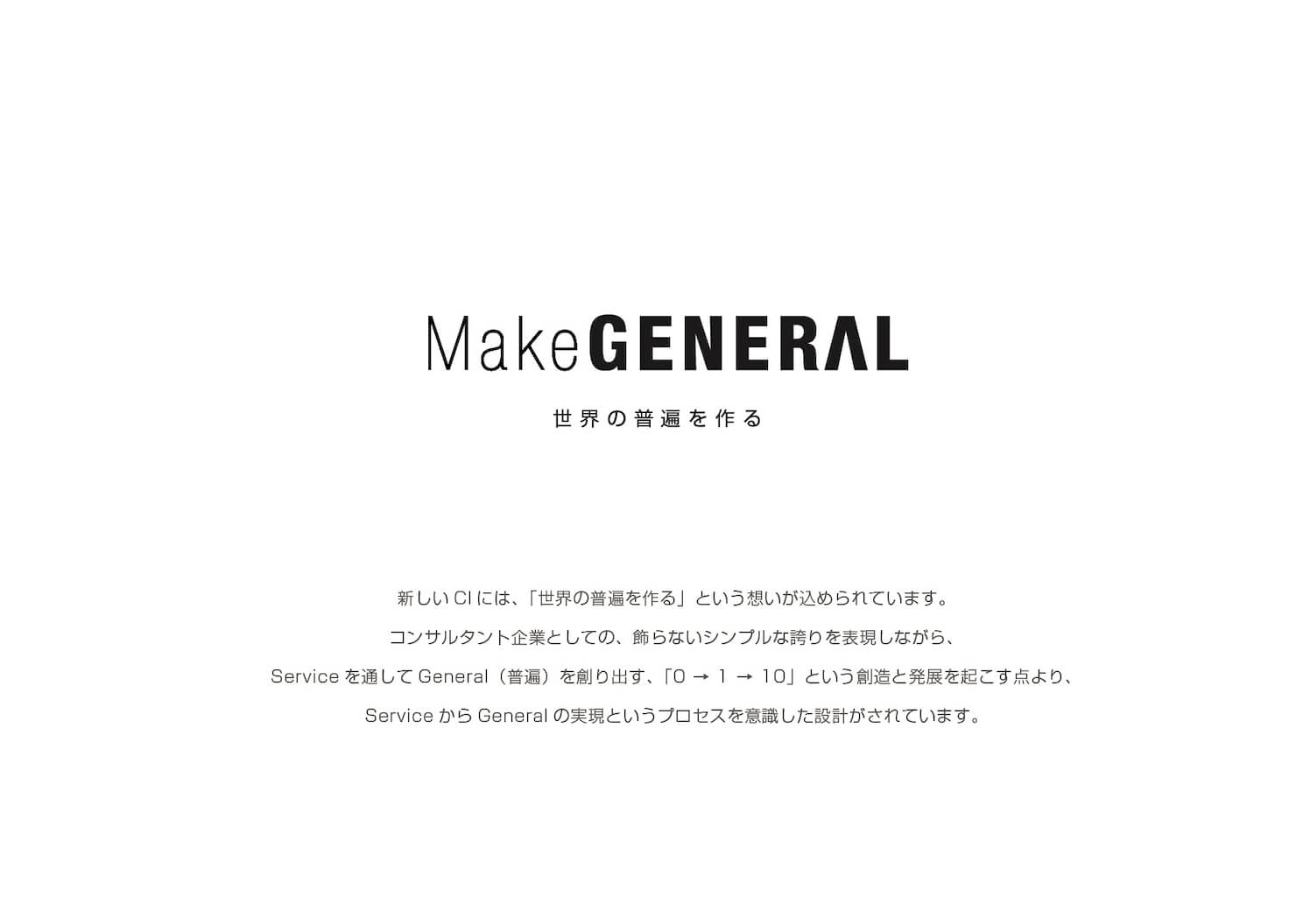事業の本質的価値、さらにその延長線上にある経営ビジョンをもとに、経営目標を「Make General」という言葉の開発とともに、再定義しました。また、役員や現場のエースプレイヤーを始め、重要ステークホルダーからの半構造化インタビューを実施。社内外の情報流通構造を理解した上で、策定した経営戦略にもとづくCIを開発。