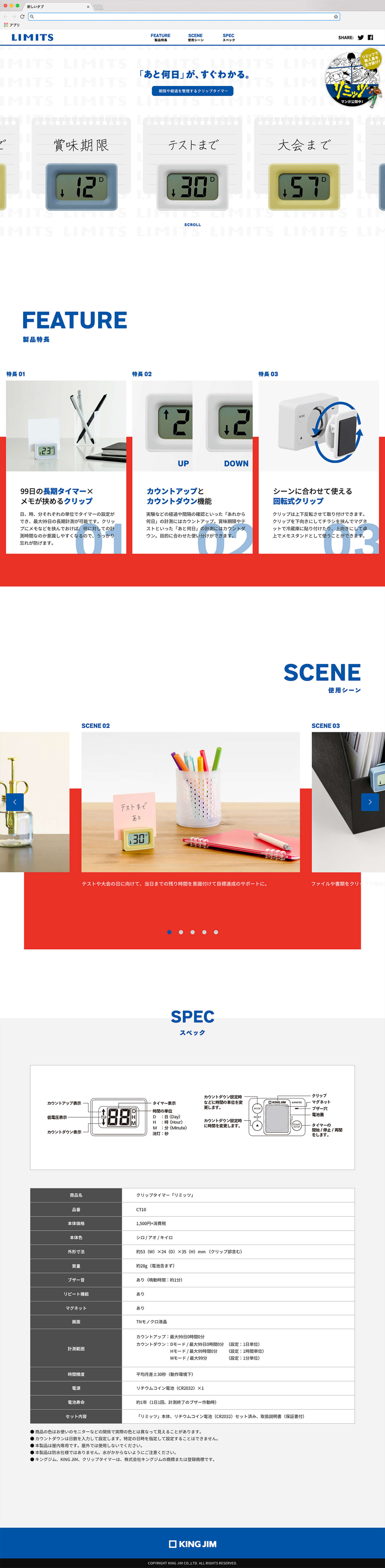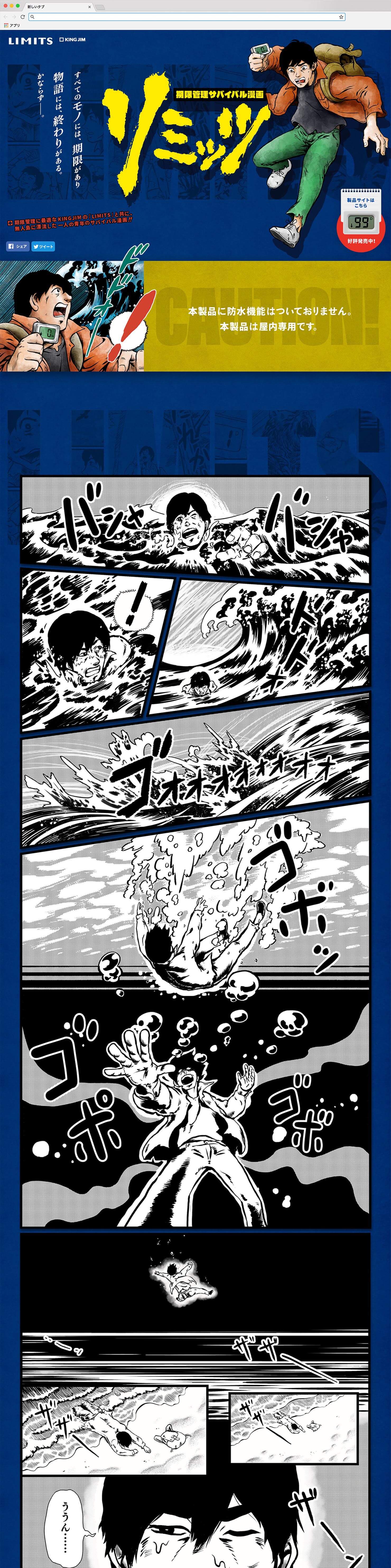 キングジムの新製品「LIMITS」のトータル/クリエイティヴディレクションを担当いたしました。ネーミング開発・パッケージデザイン・プロダクトサイトに加え、話題化させるためのプロモーションサイトを企画。期限や日数の経過がメモと一緒に管理できるという、今までにない製品の機能をしっかりと伝えながら、「時間がループする無人島に漂流した主人公が製品を使って生き抜く」という期限管理サバイバル漫画を使ったキャンペーン展開。SNSでも大きく取り上げられました。