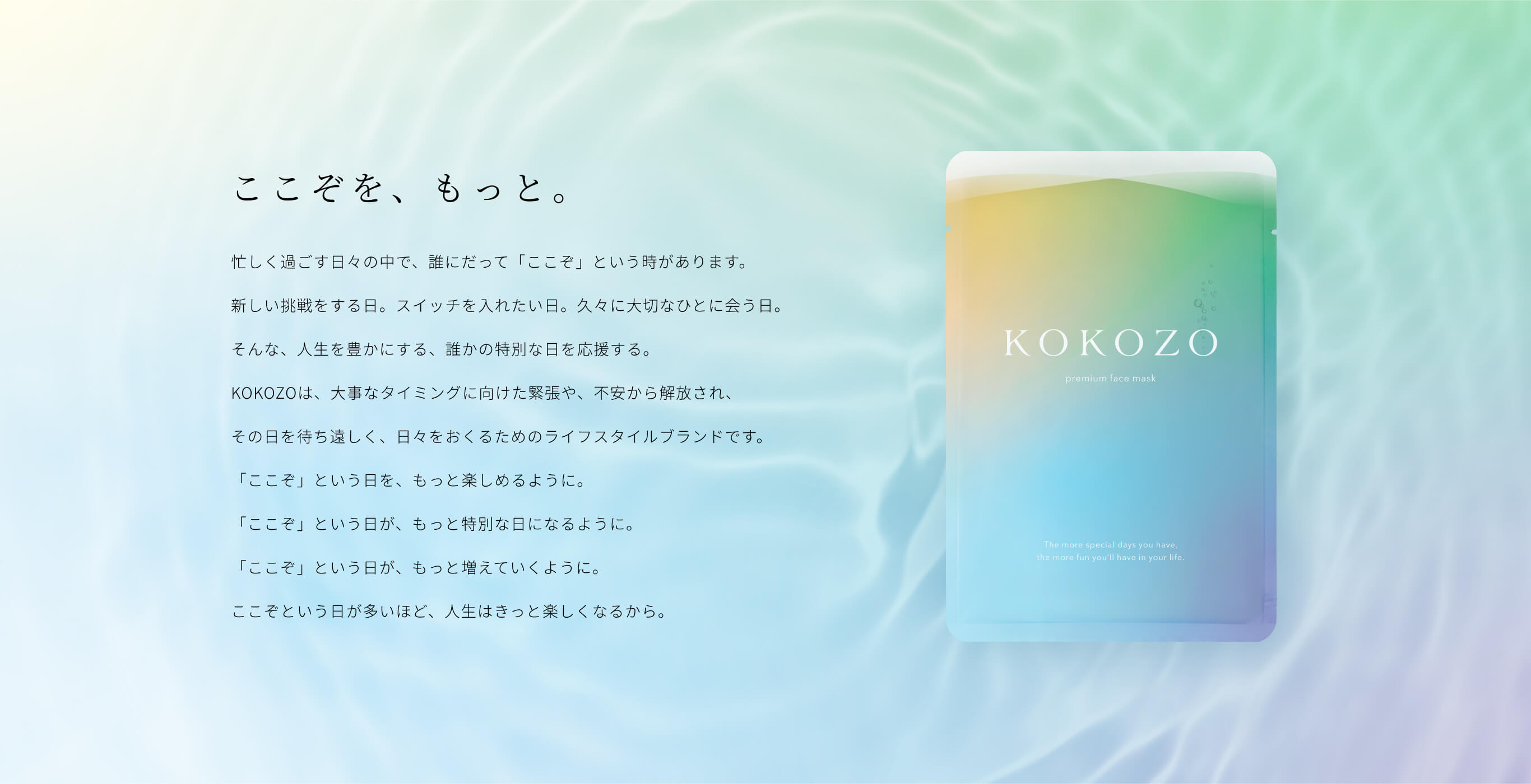 「KOKOZO」は、スキンケアを通して本質的な美しさを提供するLIGUNAがリリースしたライフスタイルブランドです。新しい挑戦をする日やスイッチを入れたい特別な日など、日常にある「ここぞ」という“本番”を応援し「肌も心も晴れやかな状態で迎えるためのサポート」をするケアを提案しています。