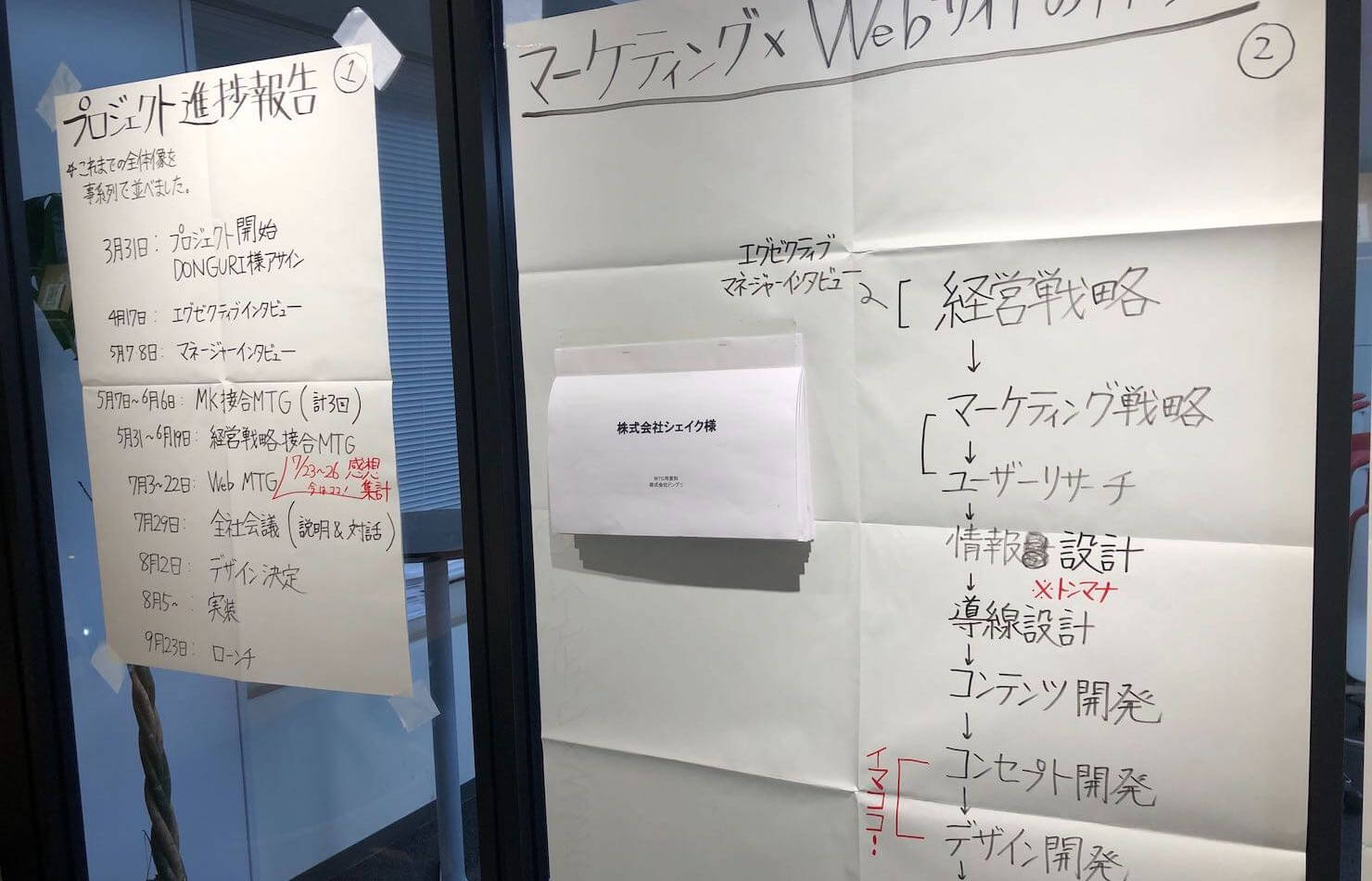 - オフィス内に模造紙にて、情報設計、デザイン開発の思考プロセスを掲示。ビジュアルや言葉の選定などについて、社内メンバーのフィードバックをもらえるよう工夫しました。