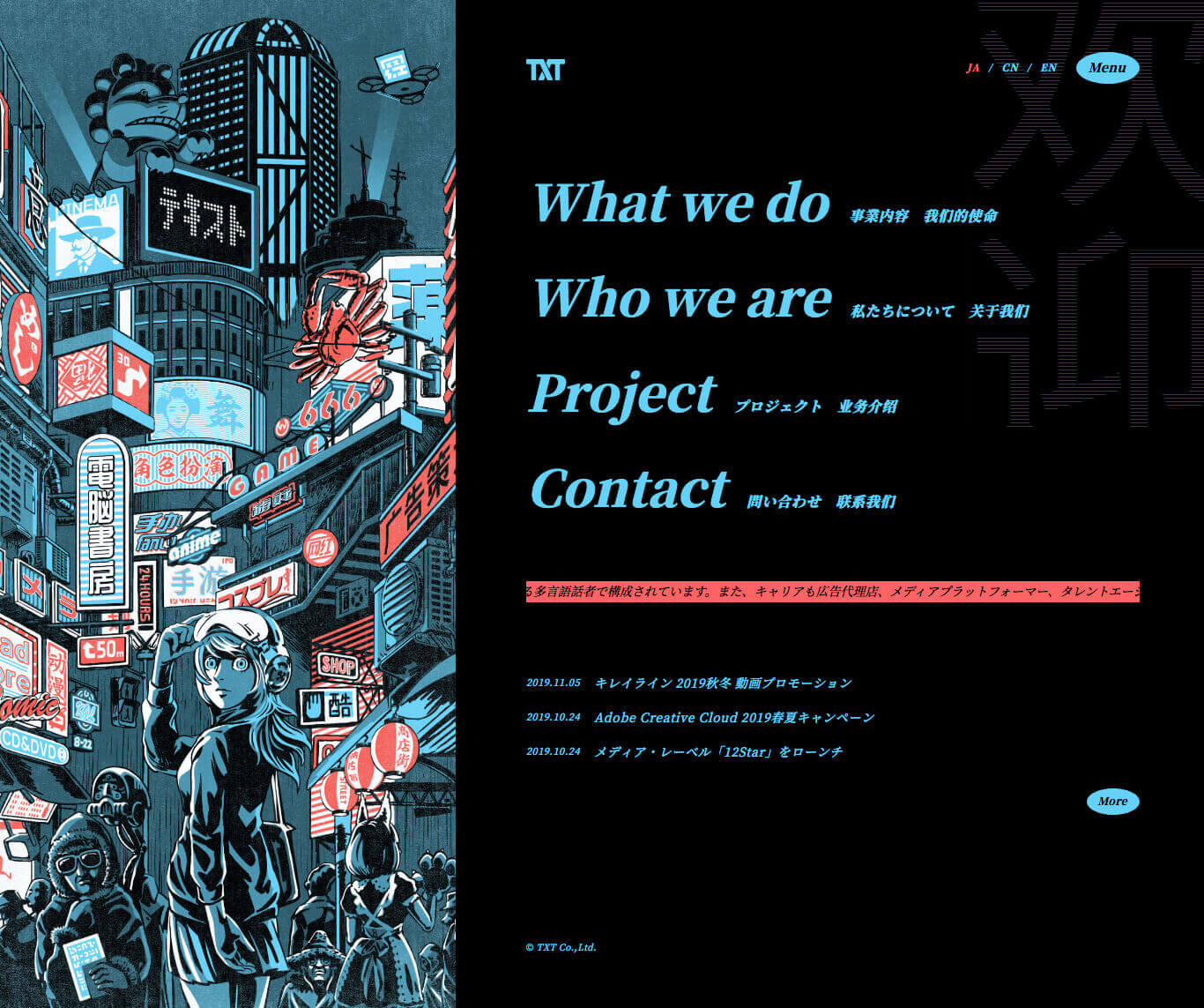 アジアをメインフィールドに展開するコンテンツプロデュース企業「株式会社TXT(テキスト)」のコーポレートサイト開発を担当しました。