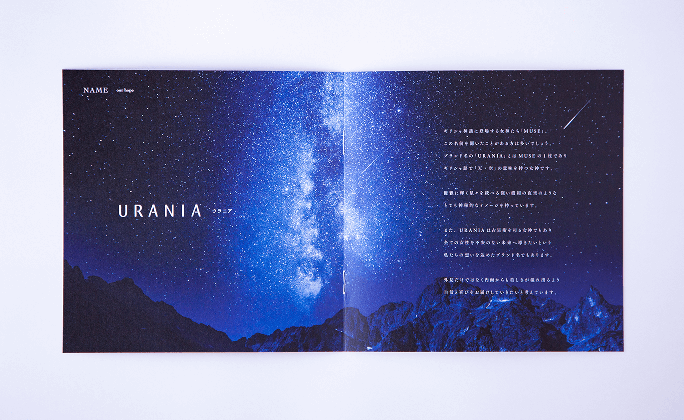 新しい化粧品ブランド「URANIA」のブランディングを手がけました。 数多くのブランドがひしめき合う市場において、「ターゲットが共感できる世界観を構築・伝達し、ブランド認知を上げる」ことを重要課題と位置づけ、ブランドストーリーを丁寧に構築。「URANIA」という名前に込められた想い、コンセプトを読み物としても楽しめる構成にしました。また、ブランドの世界観が視覚的に伝えるようなデザインに落とし込みました。